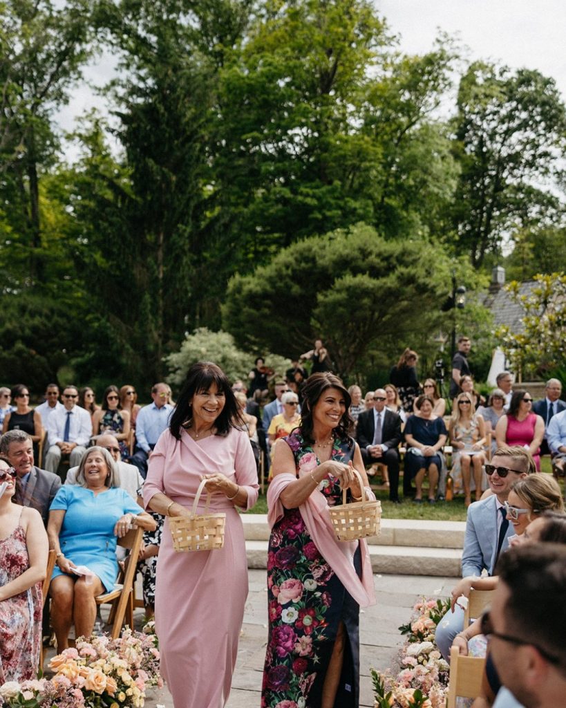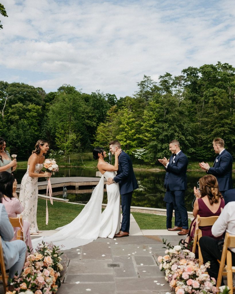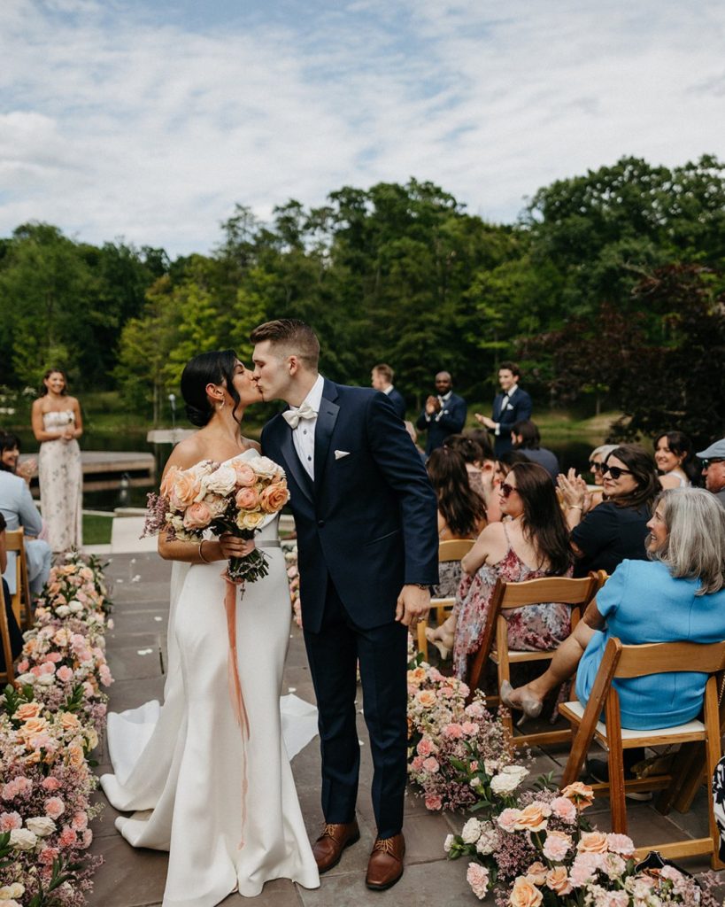 The ceremony took place just in front of a tranquil pond, offering a serene, natural backdrop that looked straight out of a painting. The aisle, lined with romantic peach and pink florals by Hannah Caraballo Designs, led the way to the couple’s heartfelt “I do’s.”