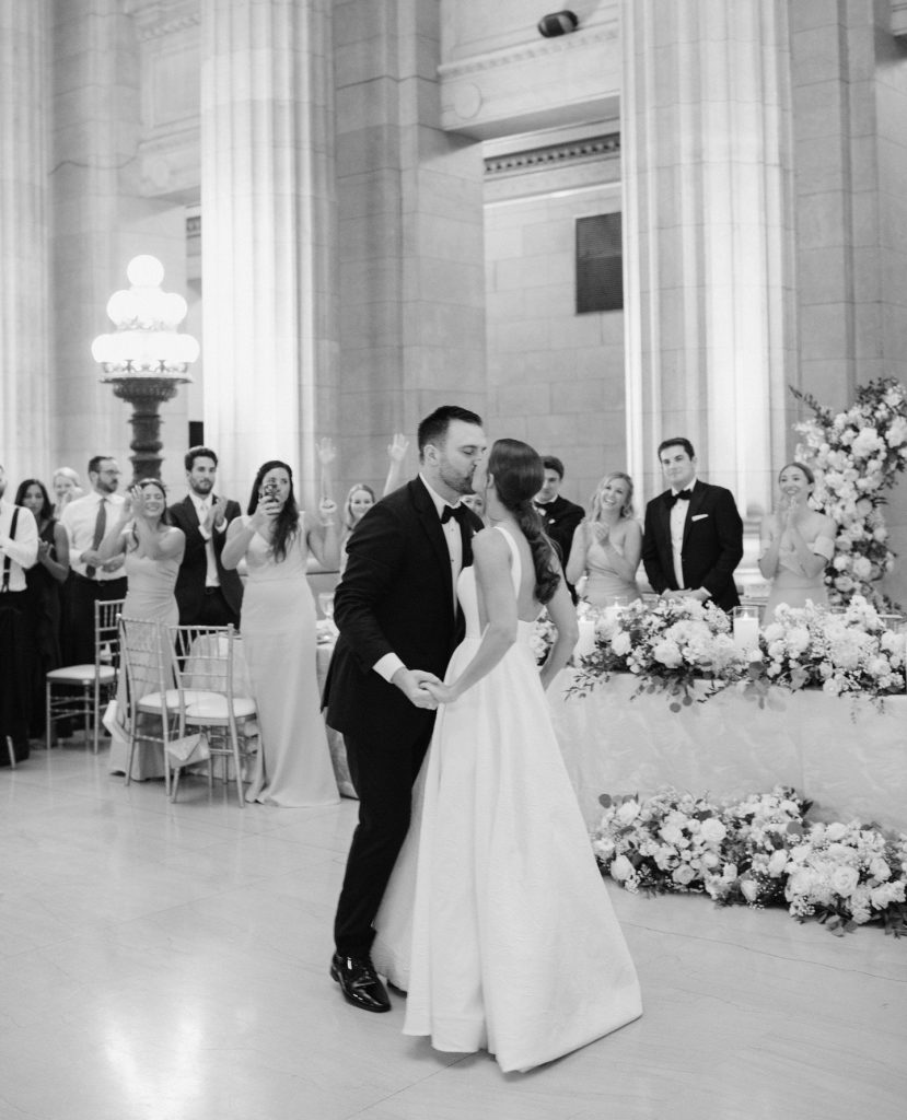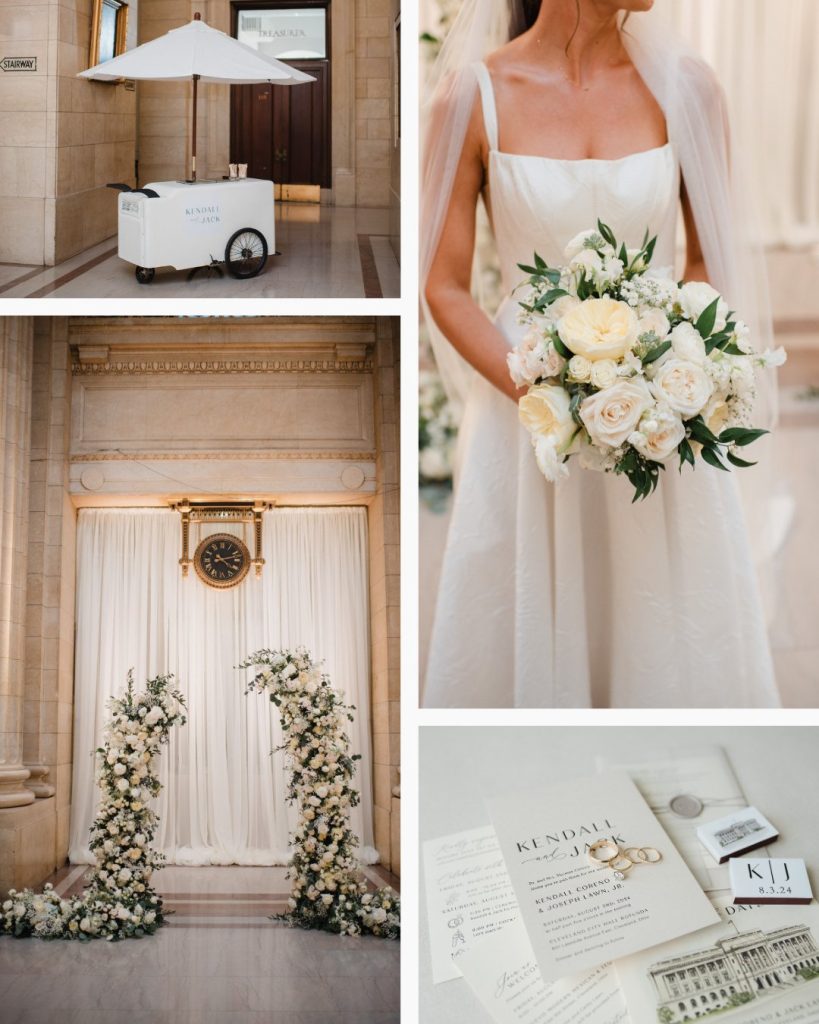 Kendall and Jack chose white florals that enhanced City Hall’s architecture without overpowering it. The arrangements added softness and romance, balancing the venue’s grandeur. Another favorite of the night, the couple delighted guests with a nostalgic ice cream cart—a playful touch that brought smiles to every age.