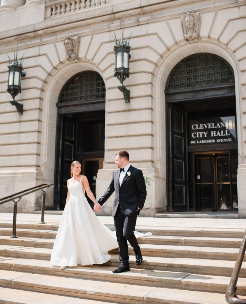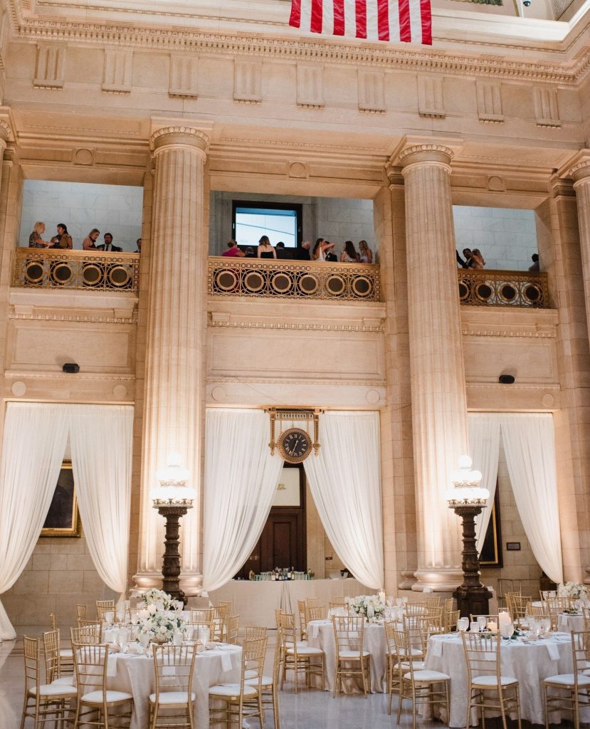 Cleveland’s City Hall provided a breathtaking backdrop for the couple’s reception. Its grand façade welcomed guests into a space filled with soaring ceilings, intricate details, and the kind of architectural beauty that elevates every moment. Soft draping and meticulously designed tablescapes added a modern touch, blending seamlessly with the historic venue.