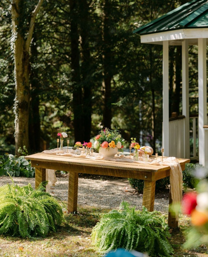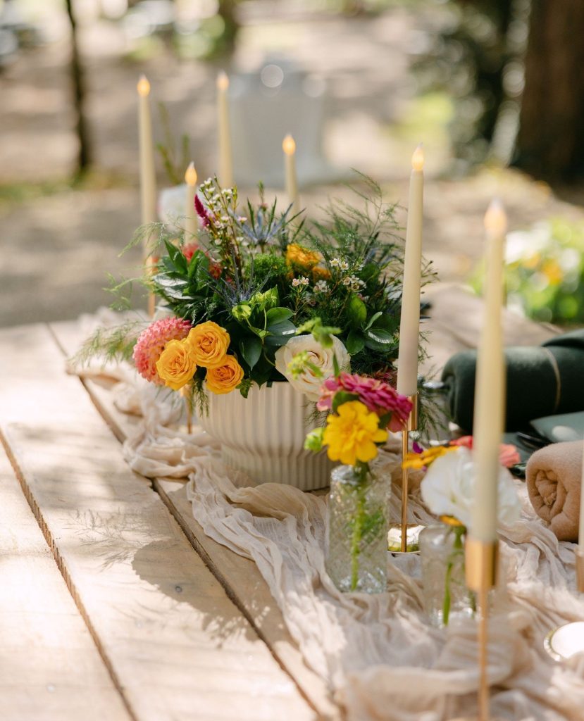 We also loved the lush florals, especially the statement dahlia that was in the bride’s stunning bouquet and bright floral colors that brought the garden party vision to life. One of our favorite design moments was the reception seating. Cori & Barrett had elevated picnic tables dressed with florals that felt both relaxed and refined. At each table, guests were welcomed with cozy blankets a fun “to have and to hold” moment – a sentimental and functional detail that perfectly matched the intimate outdoor setting. They also had a Temporary Tattoo Station, such a fun experience for guests to commemorate the evening!