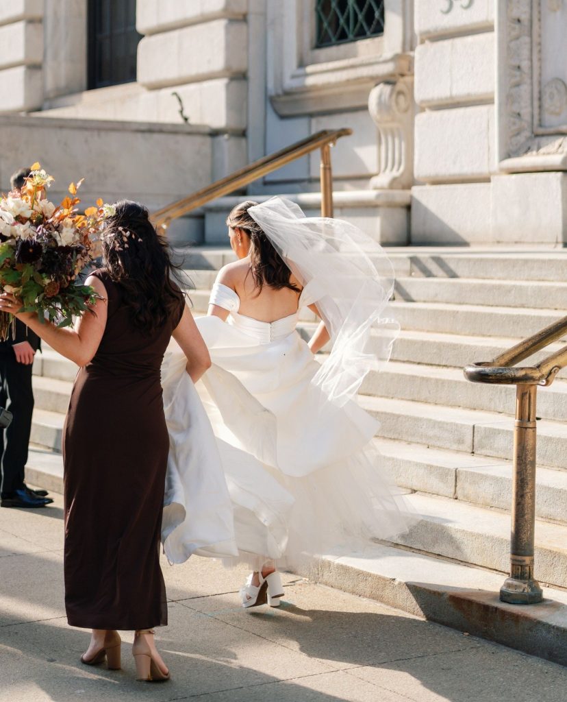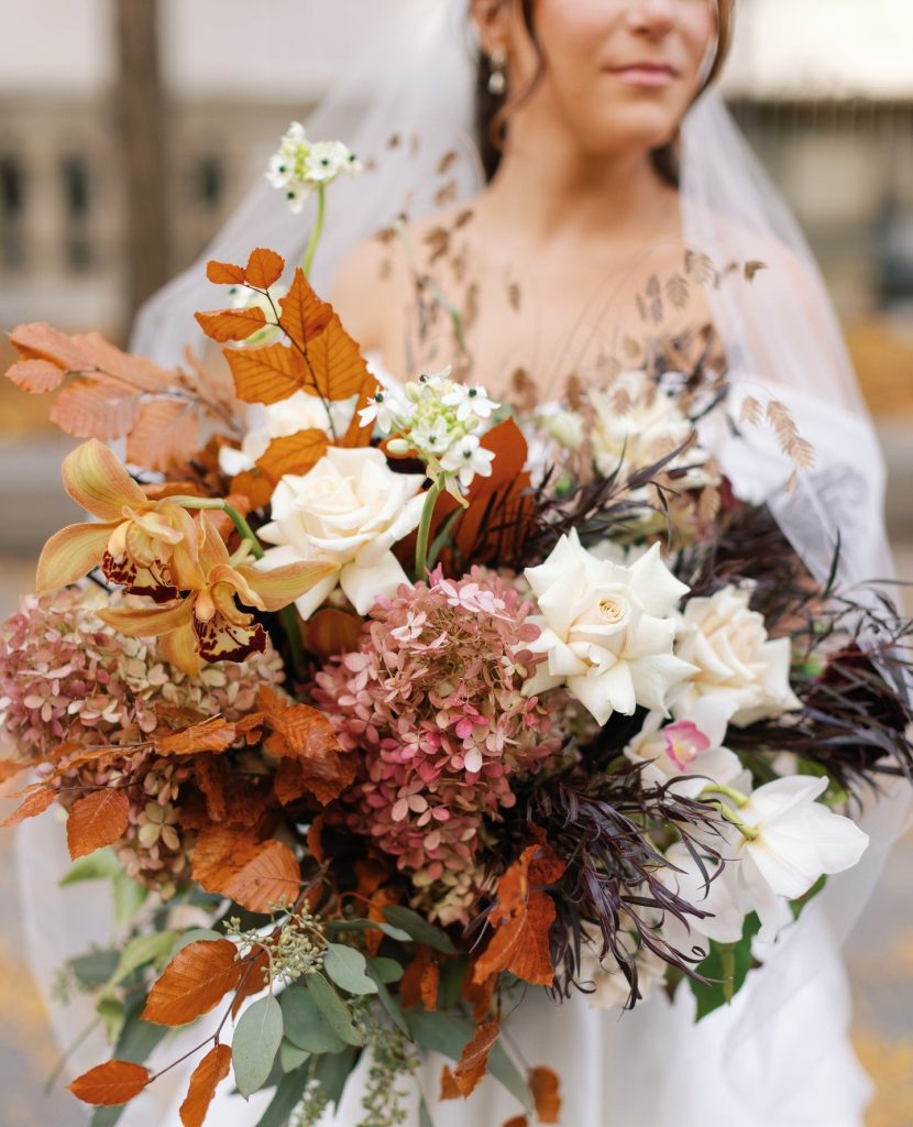 Jamie envisioned a wedding that embraced the sophistication of a city setting while incorporating rich, inviting tones and every detail reflected that vision beautifully. Their reception space came to life through stunning floral design by Plantscaping and Blooms, featuring a mix of hydrangeas and lush arrangements in warm shades of orange, blush, and plum. From the statement floral arch to the bride’s breathtaking bouquet, the florals created a cohesive, elevated look that felt both romantic and bold. The overall design struck the perfect balance between classic elegance and modern city style.