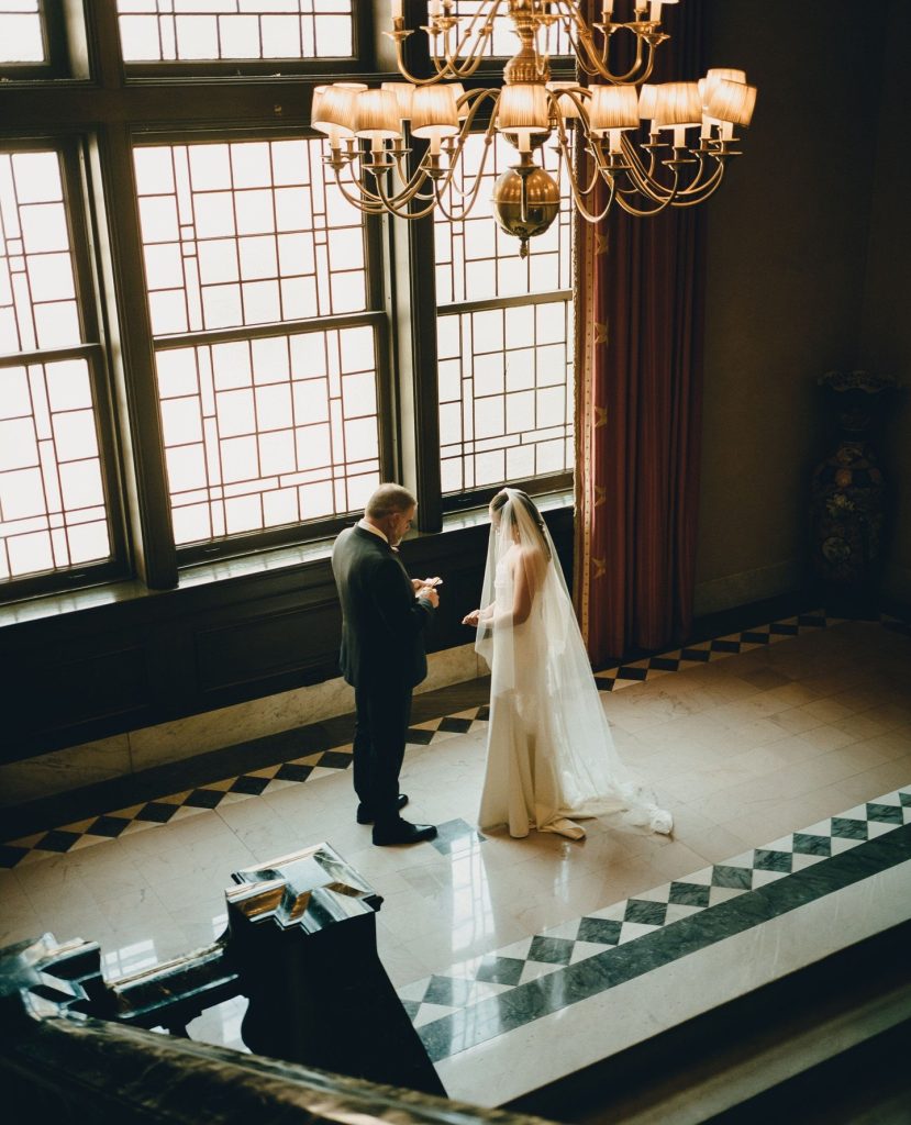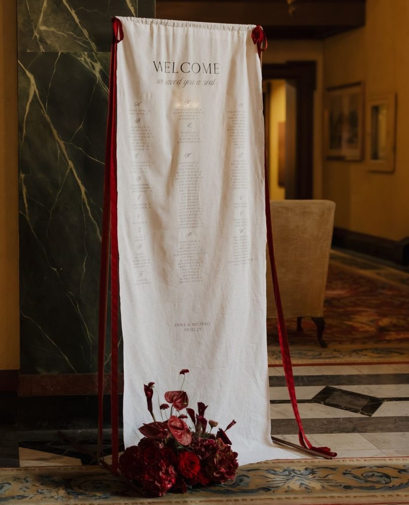 The ceremony took place by the fireplace, creating a warm, inviting atmosphere with timeless, old-school charm. Surrounded by deep scarlet florals and soft golden light, Anna and Michael exchanged vows in an atmosphere that felt intimate, luxurious, and deeply personal. This wedding exuded luxury in every detail — thoughtful, gorgeous touches that made it feel truly one of a kind, far from anything cookie-cutter.