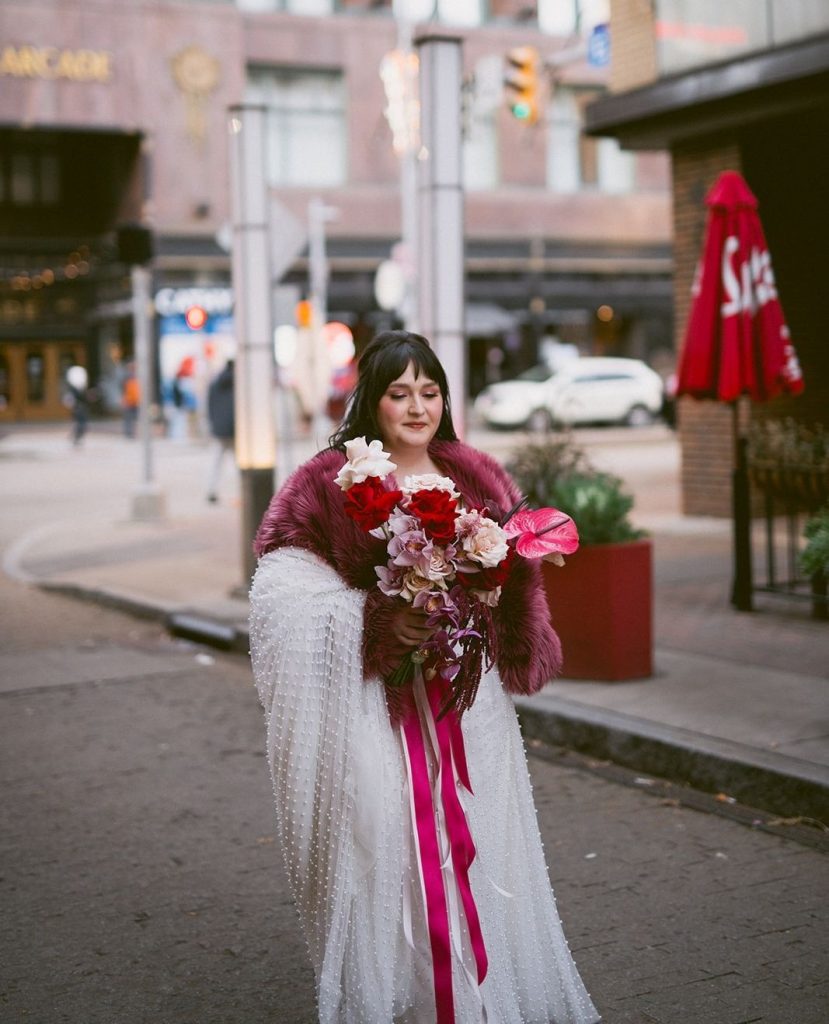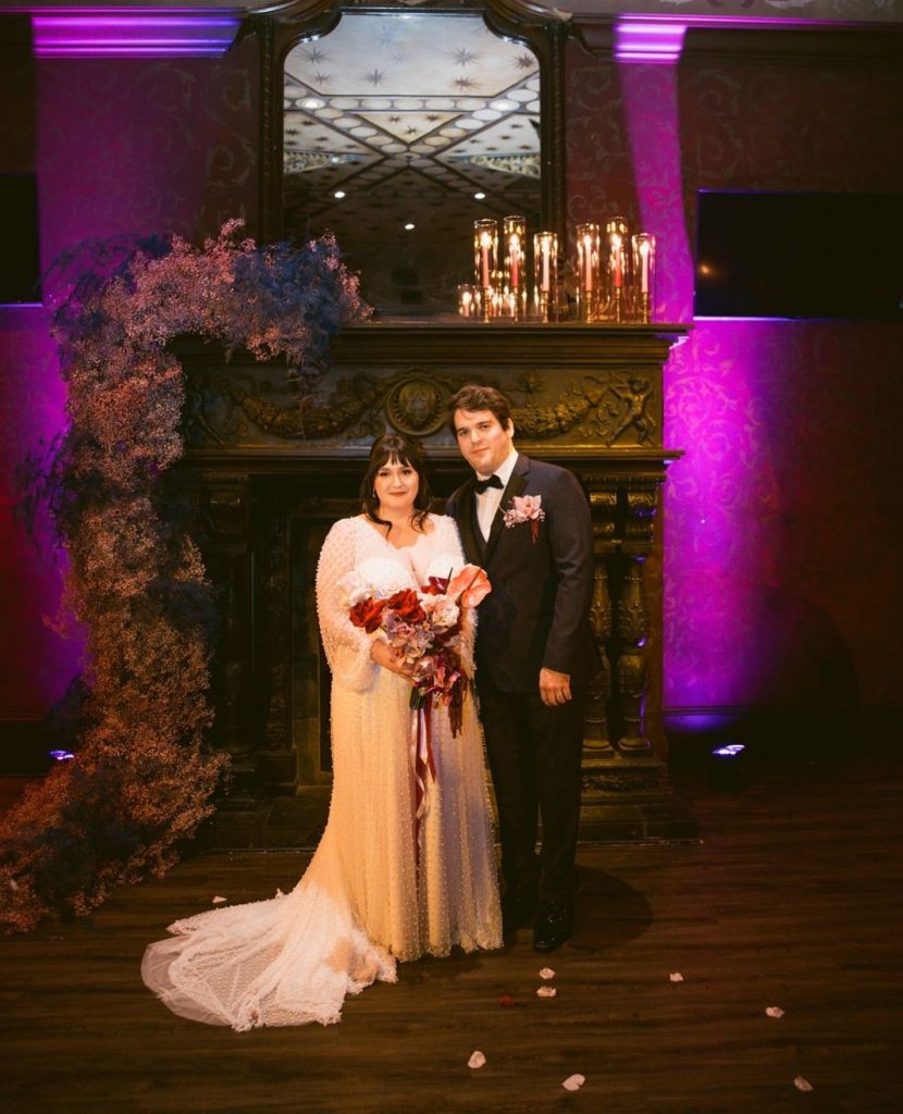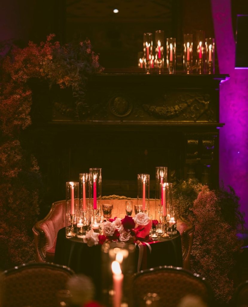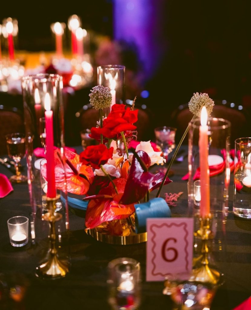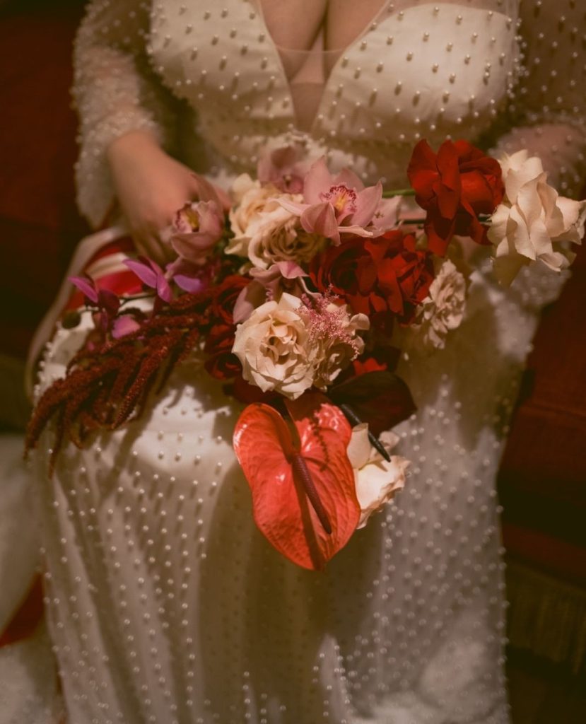 A palette of deep reds and romantic pinks set the tone for the evening, brought to life through lush, artful florals by So Bloom. Overflowing arrangements on the tables added bold, passionate moments to every corner of the space, creating a sense of depth and drama that felt both timeless and indulgent. The bride’s vintage-inspired gown was nothing short of stunning, adorned with delicate pearl details and perfectly complemented by a glamorous purple fur jacket that added a bold, Old Hollywood touch.