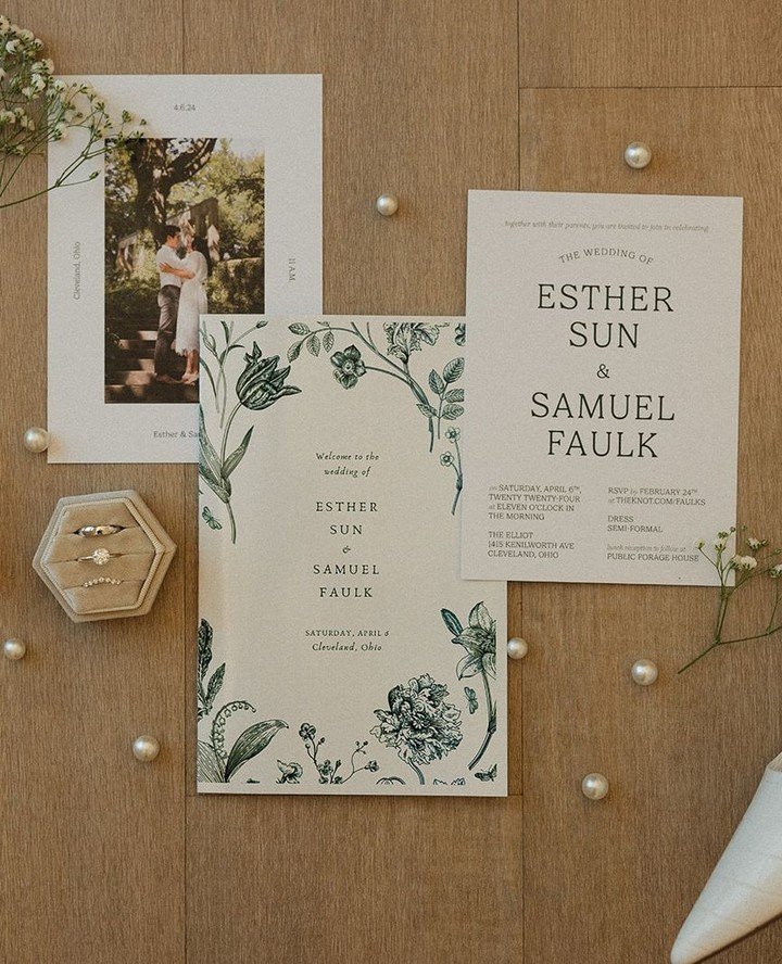 Their wedding invitations hinted at the natural elegance of the day, with a soft palette of greens that was perfect for a spring wedding. The floral arrangements featuring delicate touches of lavender, soft yellows, and subtle spring blooms-a perfect complement to the light and airy atmosphere.