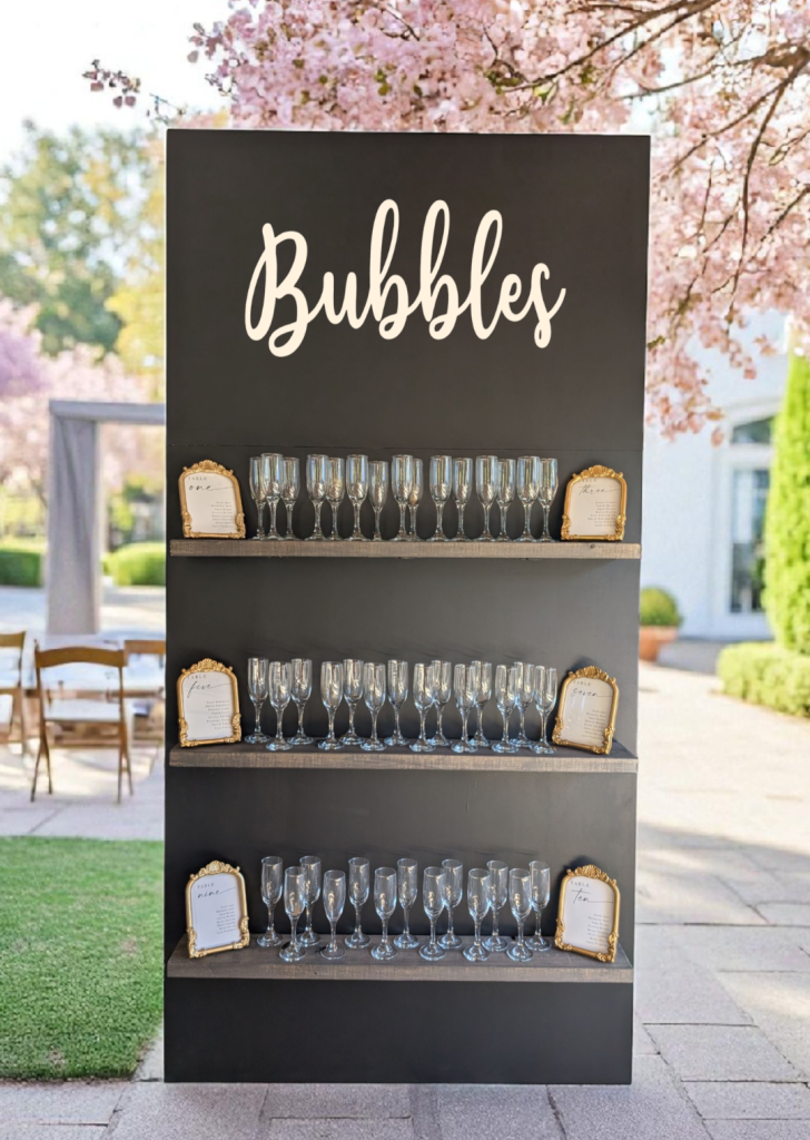 Standing at an eye-catching 7 feet tall, these walls instantly transform the space. With options ranging from mini walls for intimate gatherings to large-scale displays holding up to 80+ glasses, there’s truly a fit for every celebration.