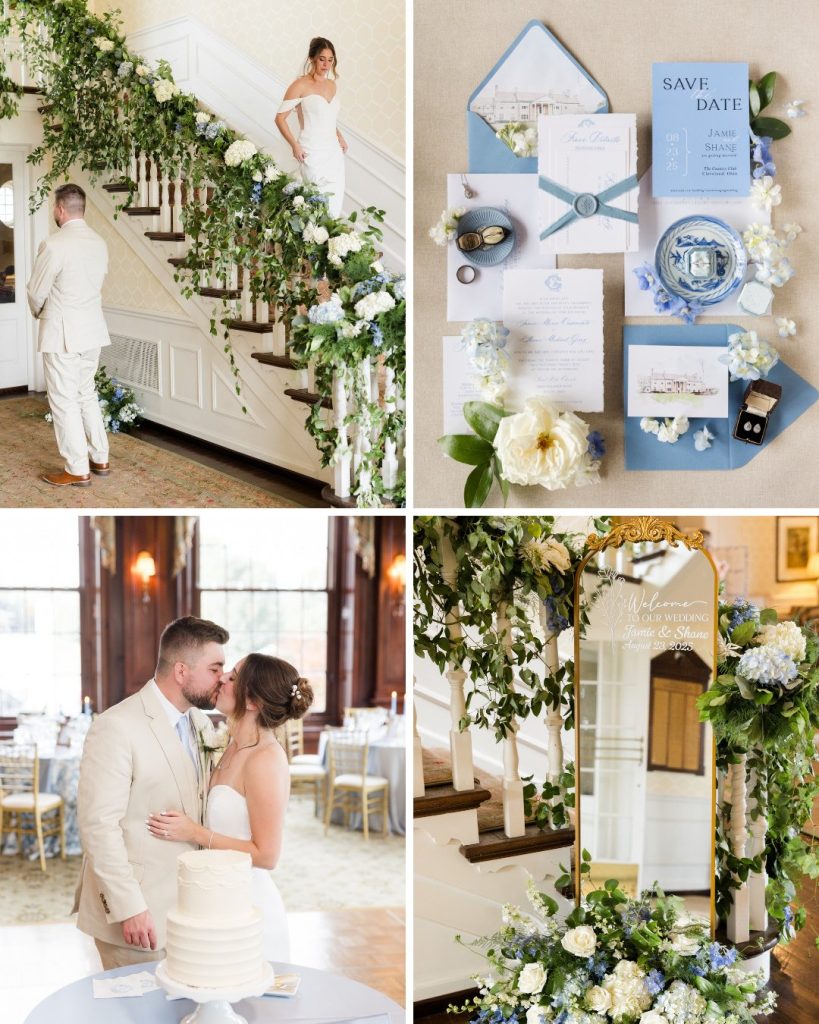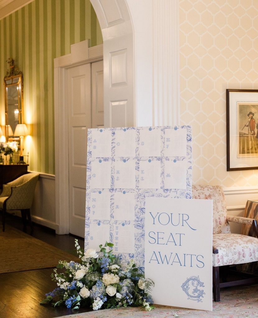 Every detail of the celebration felt intentionally crafted, thanks to the talent of Singsolo Designs, whose stunning invitations and signage set the tone for the day. From the paper suite to the décor accents (that gorgeous seating chart!), each piece complemented the couple’s palette of soft, romantic blues.