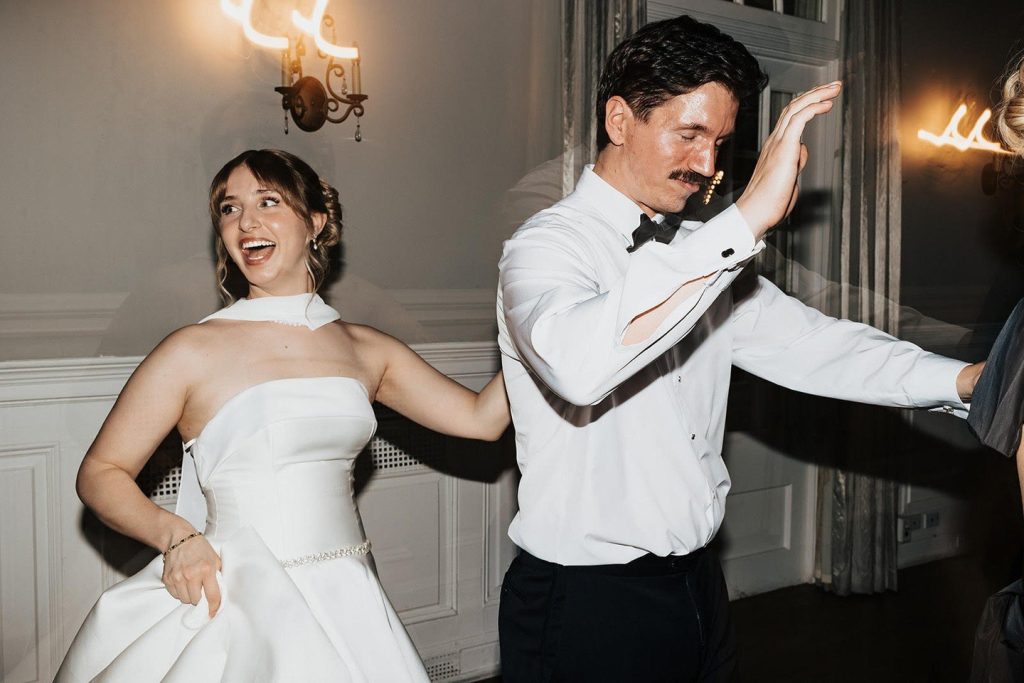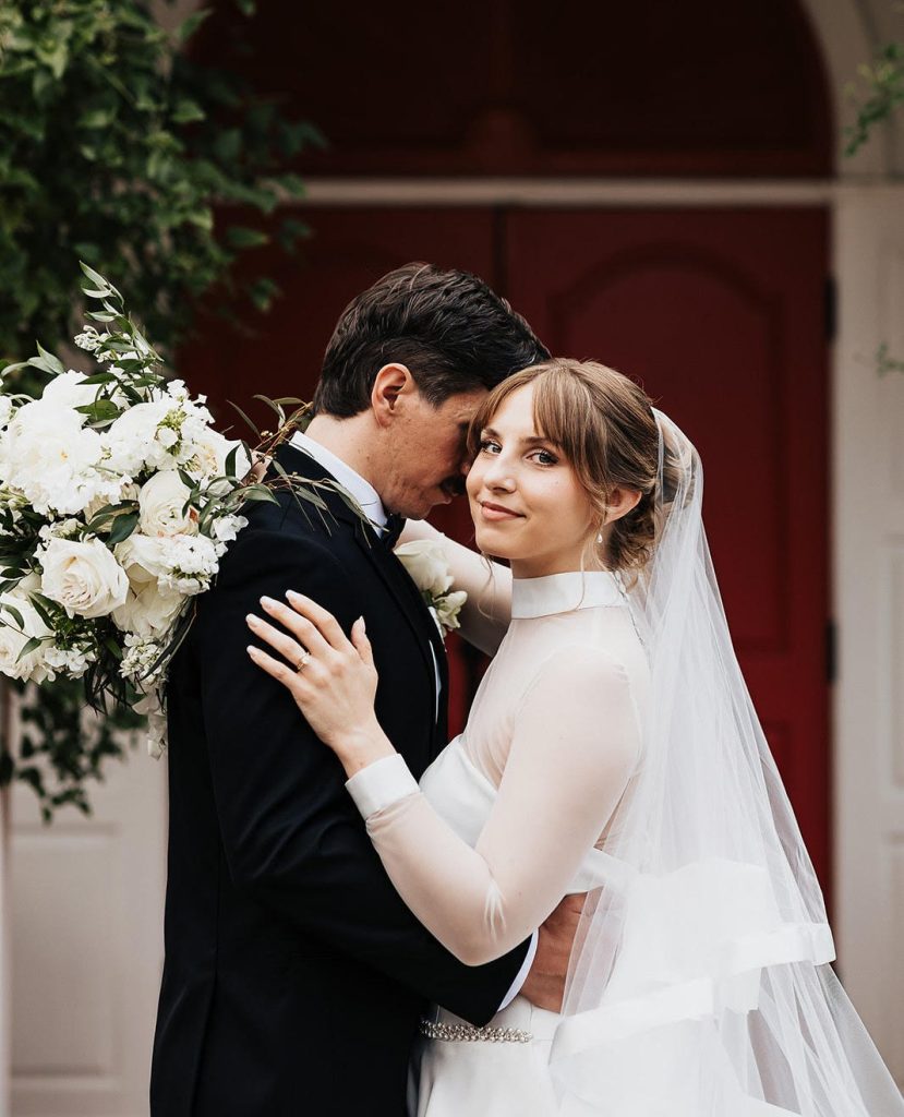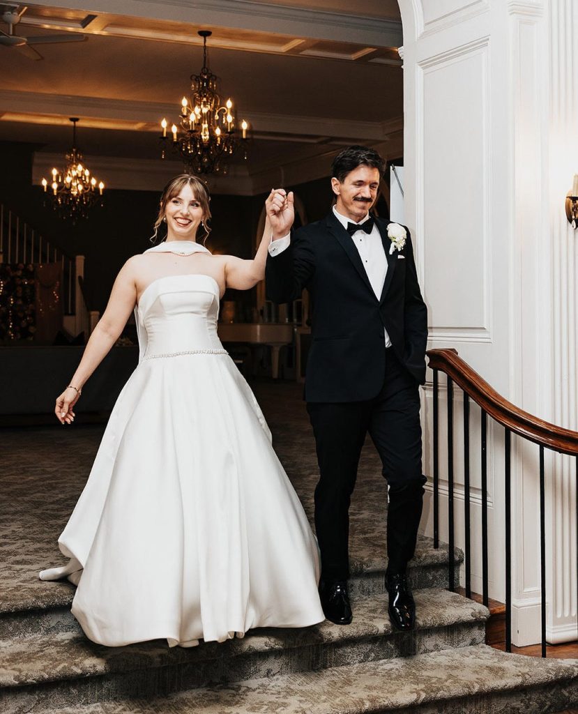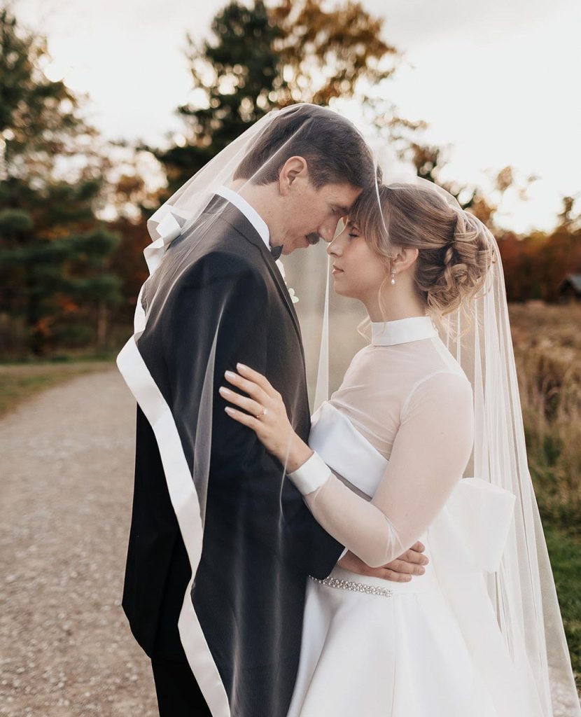The couple looked absolutely breathtaking from the moment they said “I do.” The bride wore a show-stopping gown from Brides by the Falls, where the experience of finding the one was just as incredible as the dress itself. Designed with the season in mind, the gown featured dreamy, see-through satin sleeves that were perfect for a crisp fall day. As the celebration transitioned into the evening, the sleeves were removed for a fresh, sleeveless look—proving just how versatile and thoughtfully designed the gown truly was. A draped bridal scarf completed the look, adding an editorial, fashion-forward touch that felt both modern and timeless.