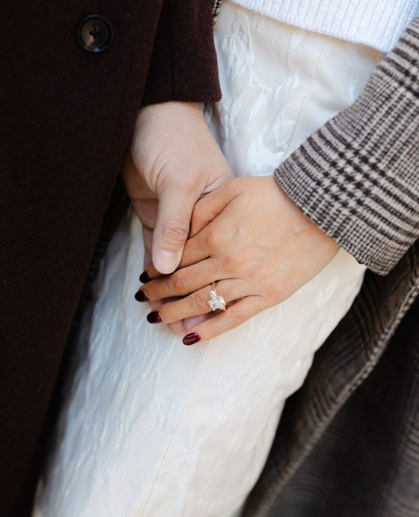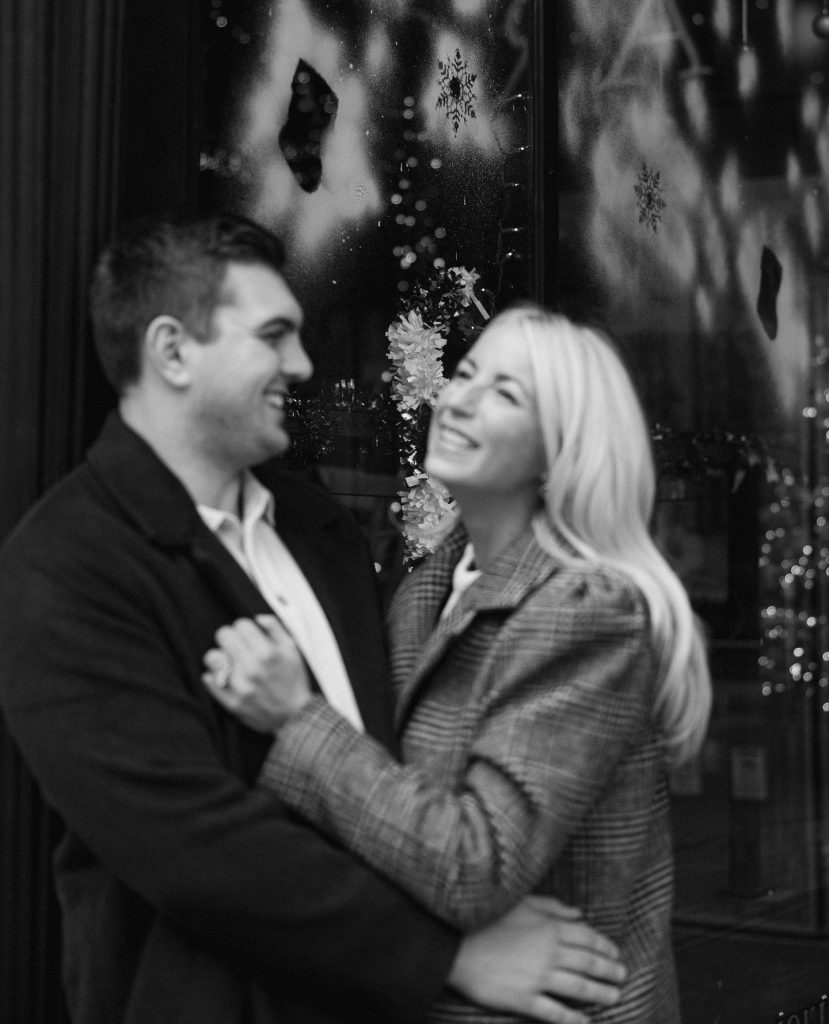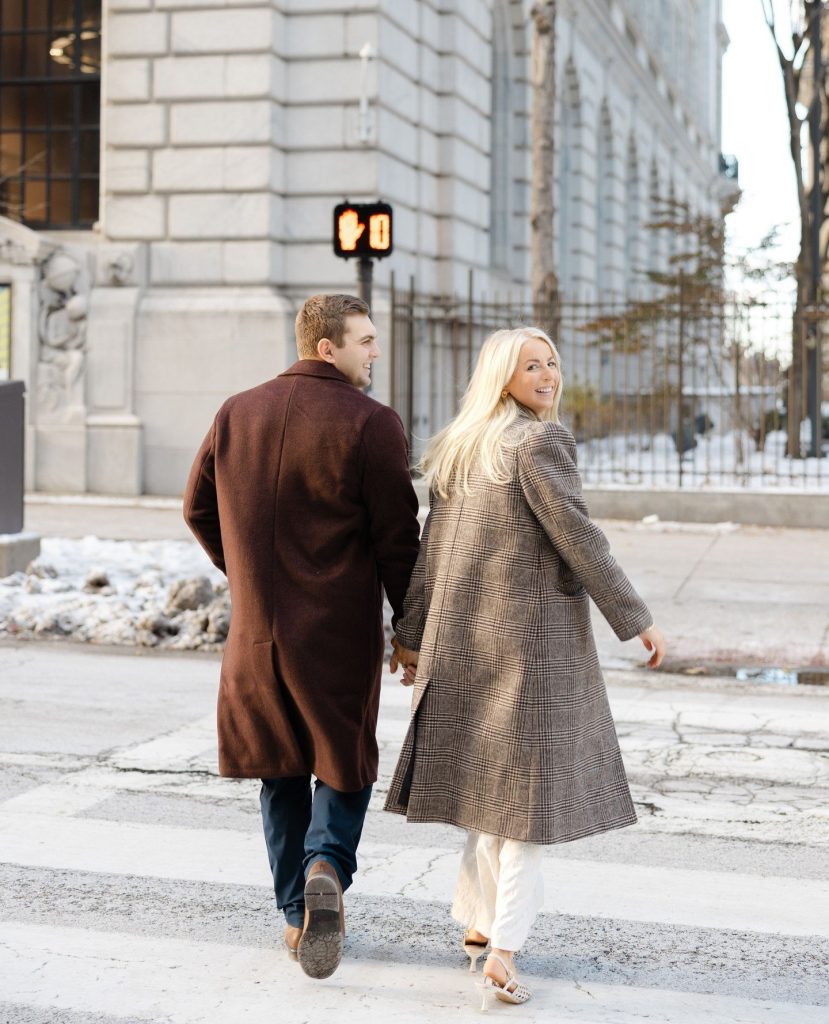 The bride-to-be wore an effortlessly chic all-white ensemble that stood out beautifully against the winter landscape, while her fiancé’s classic peacoat added a timeless touch-perfect for the snowy weather and crisp winter air. We love the style inspiration they brought to their session, take notes if you are planning your engagement photos! As winter sunlight peeked through the city streets and reflected off the snow-covered ground, Photos by Teenzy captured their natural glimmer of laughter, joy, and the undeniable connection they share.