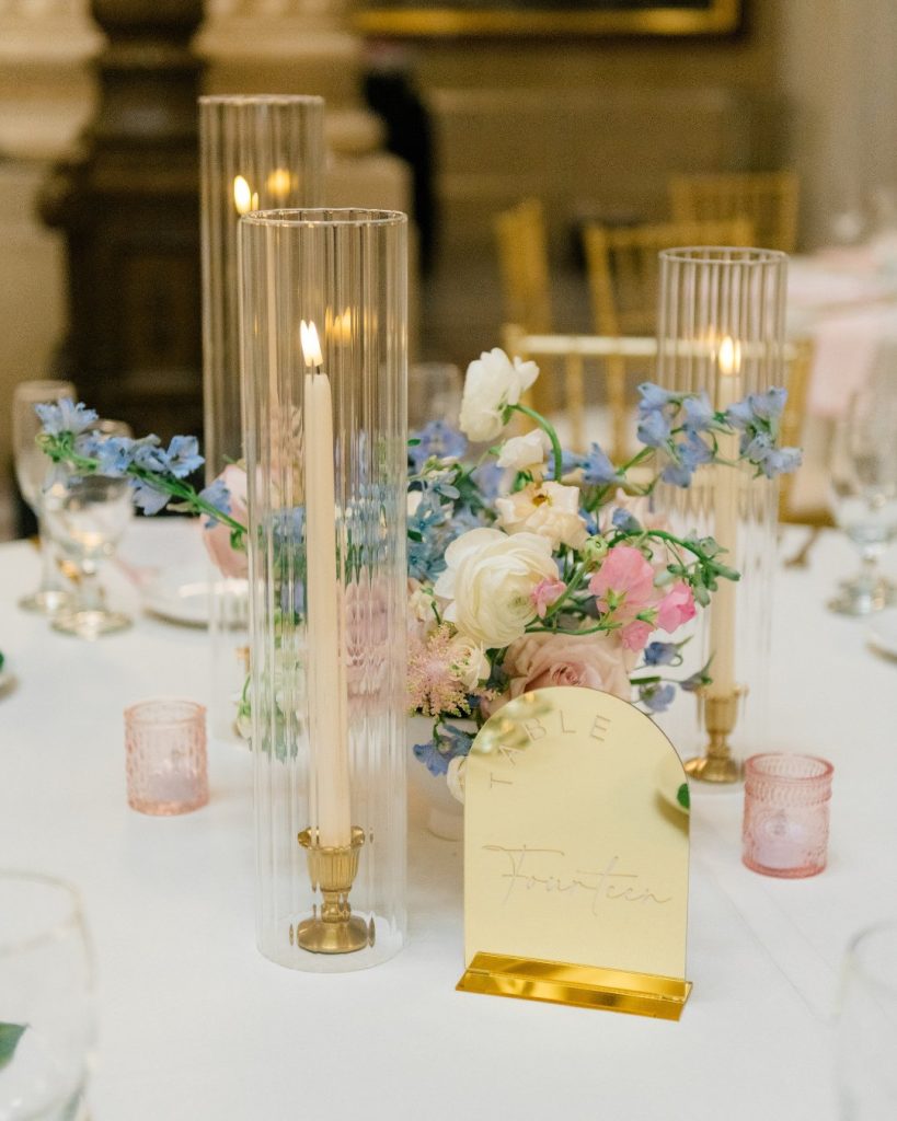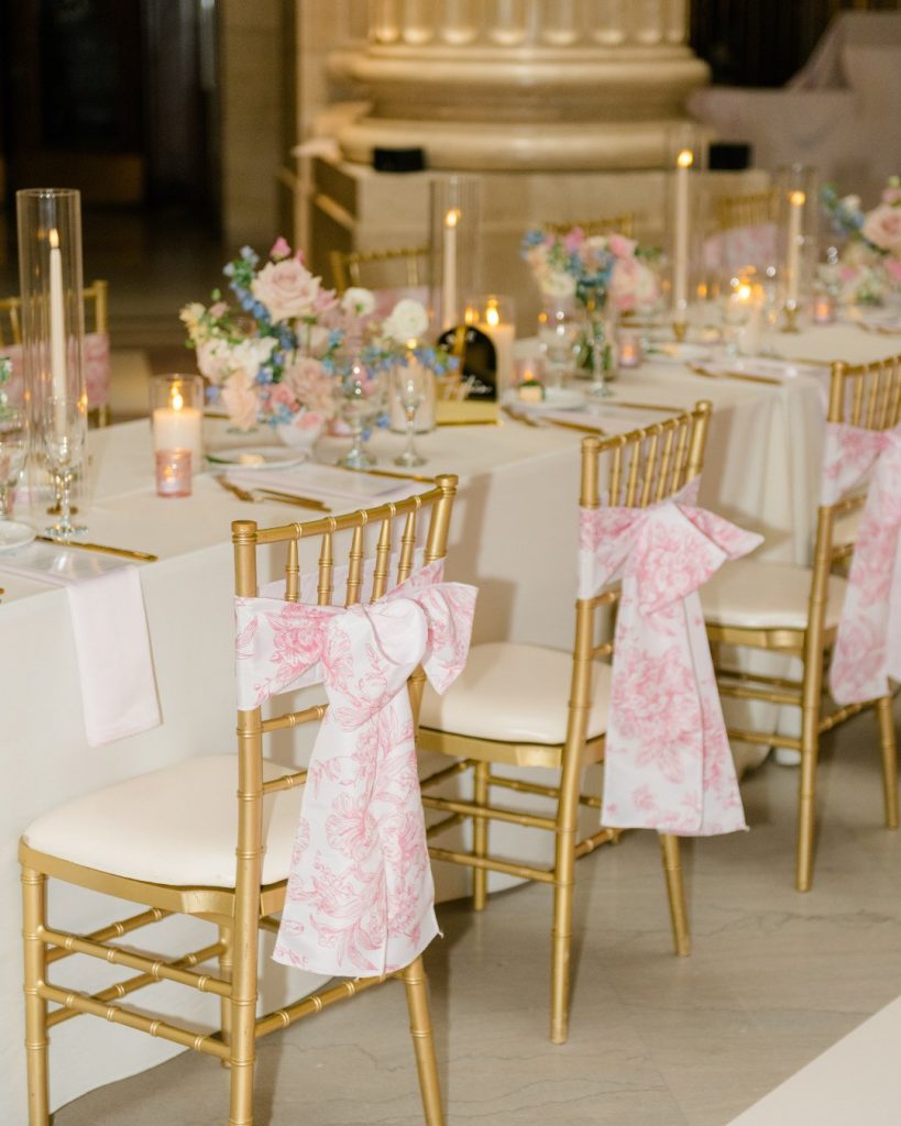 The reception was a study in pink done right-think pink checkered dance floors, pink floral linens that felt both classy and whimsical (Loveshack Fancy vibes, anyone?), and delicate pink bows on the backs of gold chairs that added the perfect finishing touch. The florals were a joyful mix of pinks with pops of baby blue, bringing a fresh, fun energy to the elegant space.