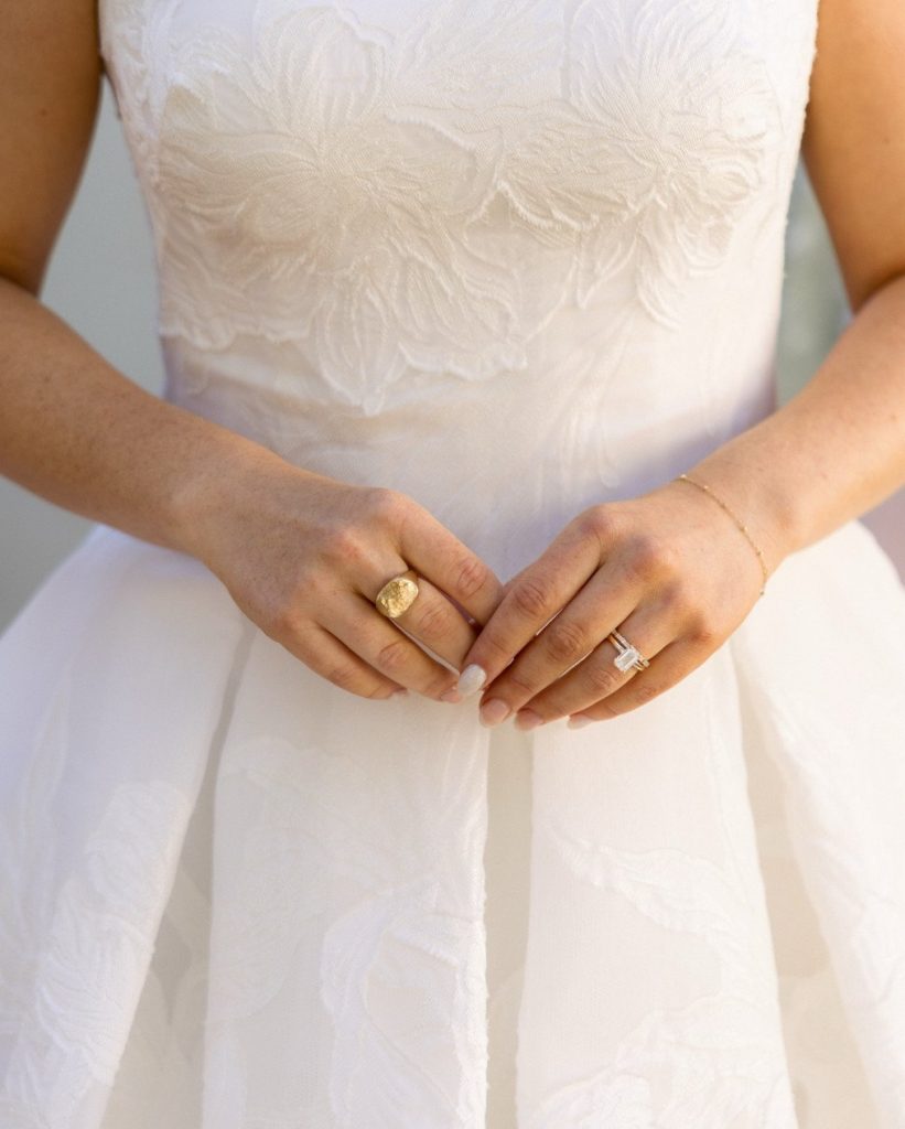 Gina said yes to the dress in the heart of Chagrin Falls, Ohio, a moment that marked the beginning of a look that would travel far beyond where it started. Her off-the-shoulder gown, found at one of Cleveland’s most beloved bridal boutiques Brides By The Falls, features intricate floral stitching from head to toe, creating a timeless and romantic feel that instantly stood out.