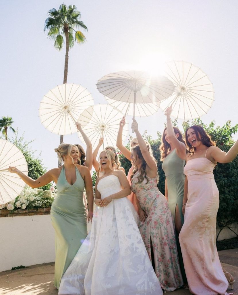 Some details we still can’t get over: the green tablescape that effortlessly complemented the natural surroundings, the vibrant pink and green bridesmaid dresses, and the parasols-both the cutest accessory and a perfect way to beat the summer heat.
