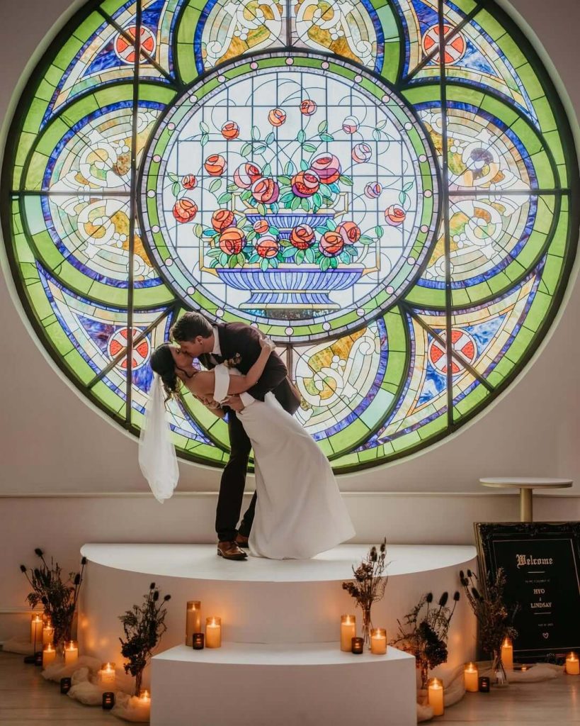 Unique Features: Iconic rose window; original stained glass; quartz bar and open floor plan; 8ft. Swarovski-crystal chandelier