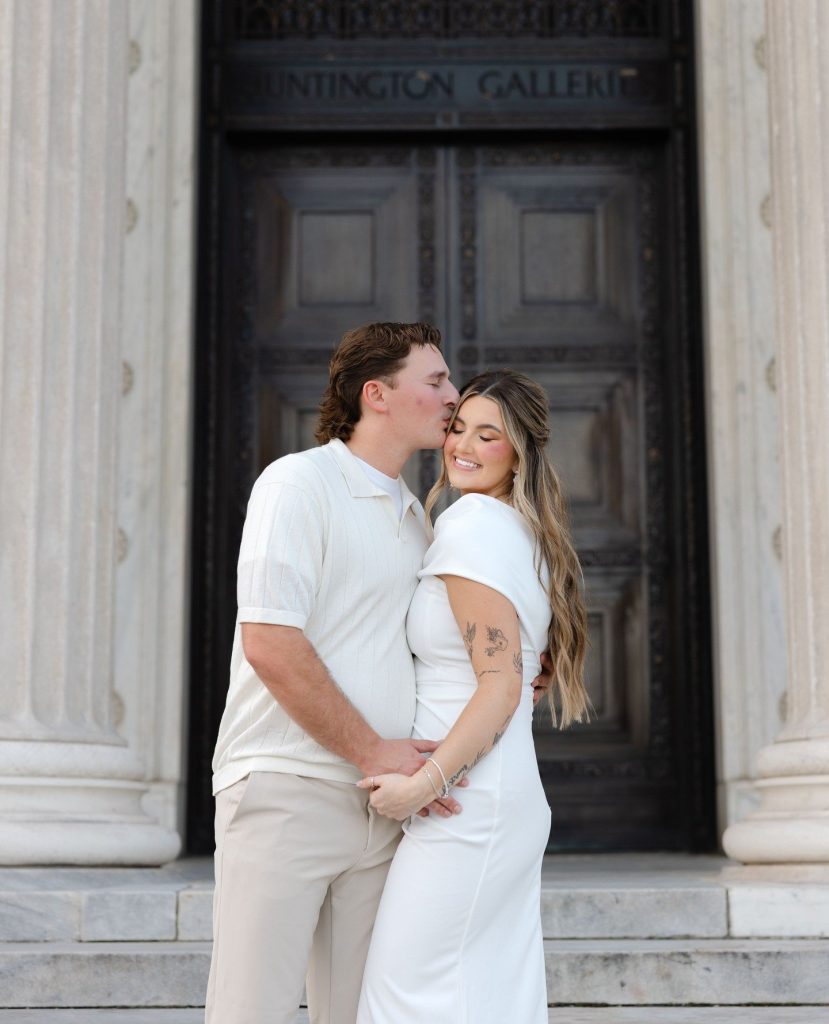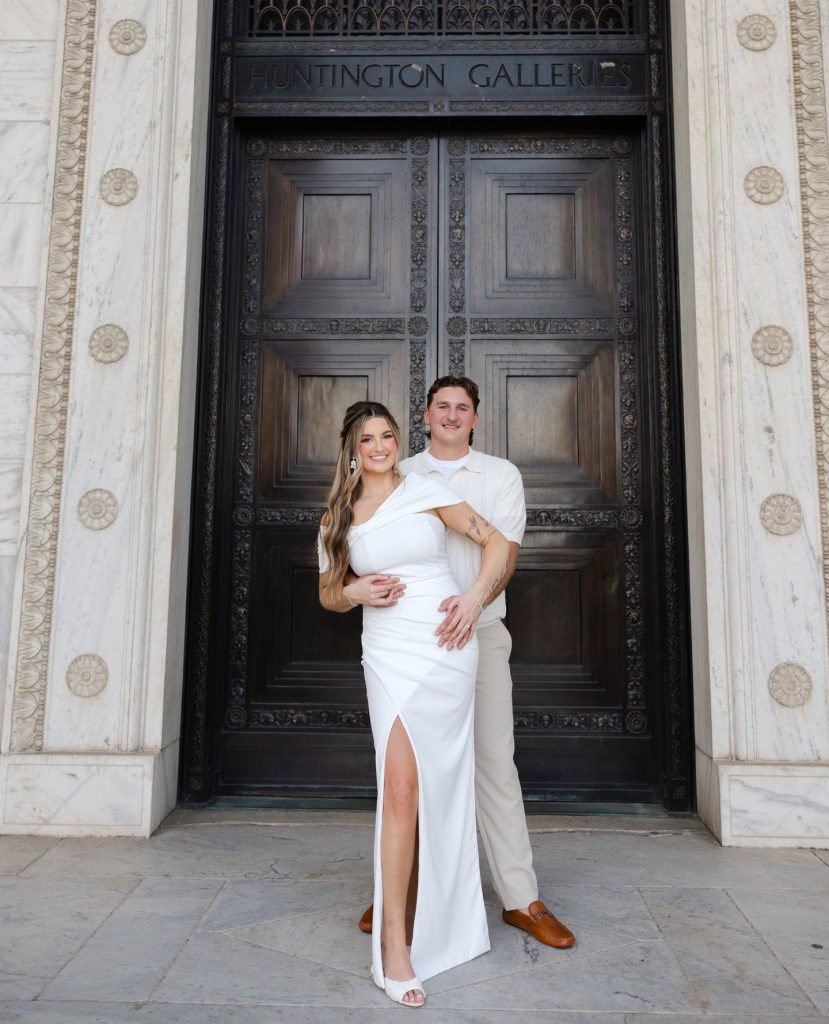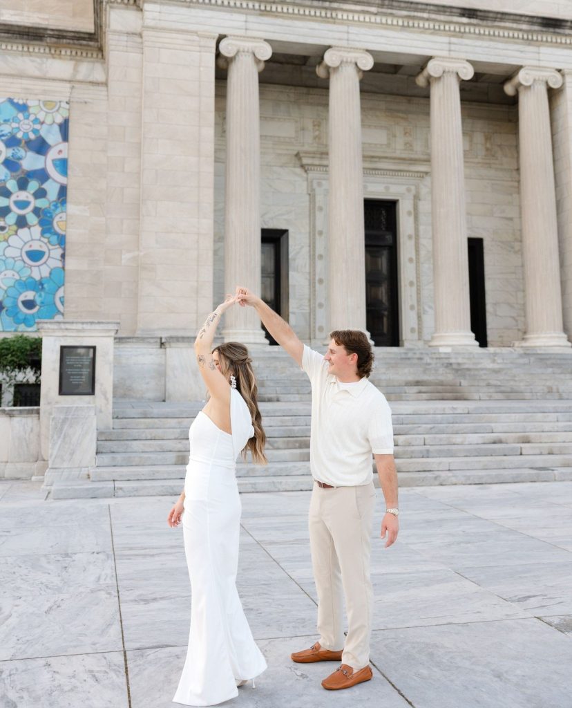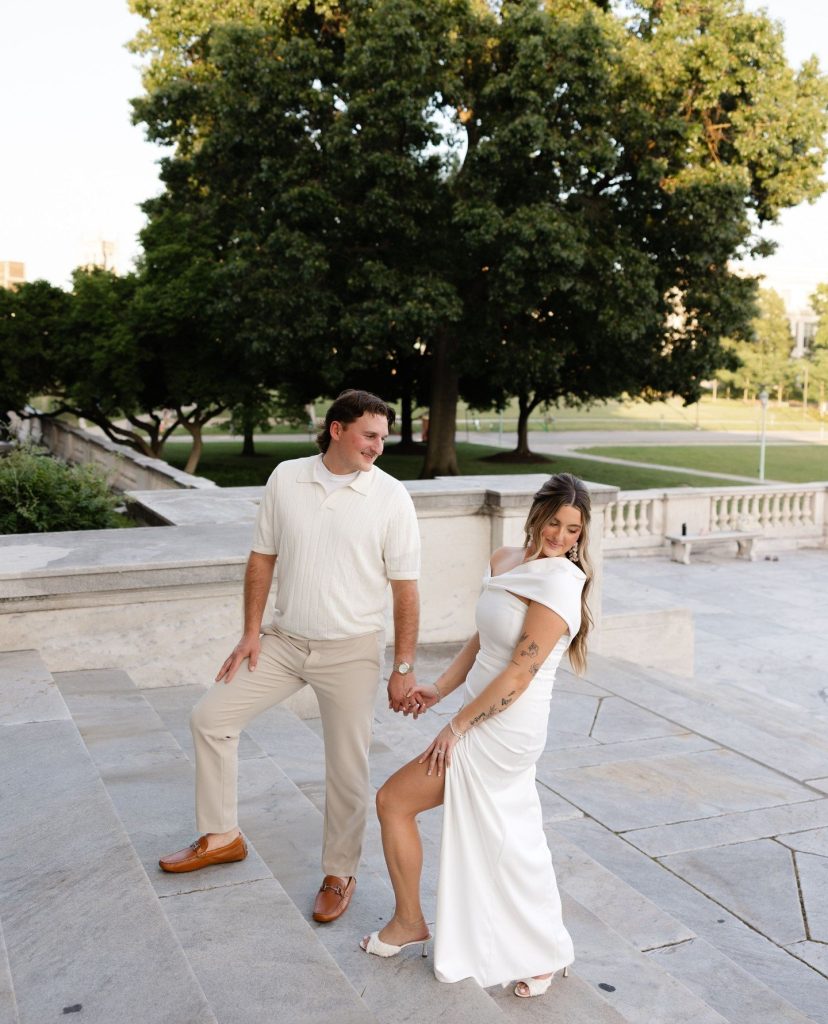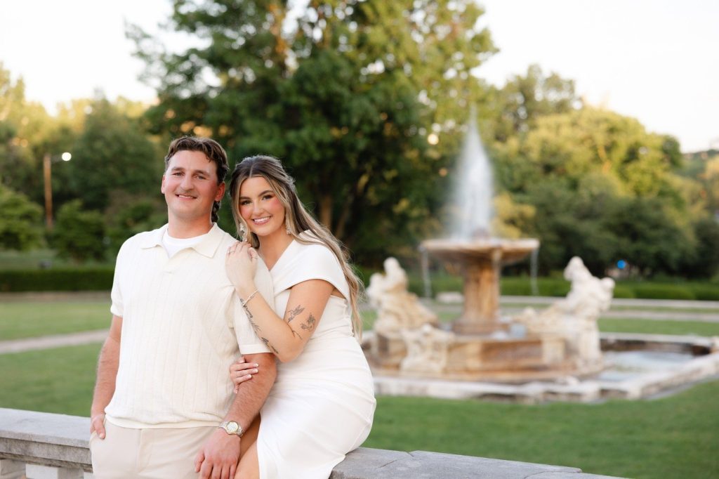 Tina knows all the best spots for an engagement shoot, and this one did not disappoint. Part one of the engagement shoot was at a beautiful water fountain. With the fountain as their backdrop, the sunlight danced off the rippling water, adding a soft glow to the already radiant couple. Jada looked effortlessly graceful in a white off-the-shoulder dress paired with delicate heels, while Sam kept it classy with a tailored look that perfectly complemented his bride-to-be. Together, they brought a modern sophistication to their session. The intentional prompts from Tina let Jada and Sam simply be themselves, and it shows in every photo!
