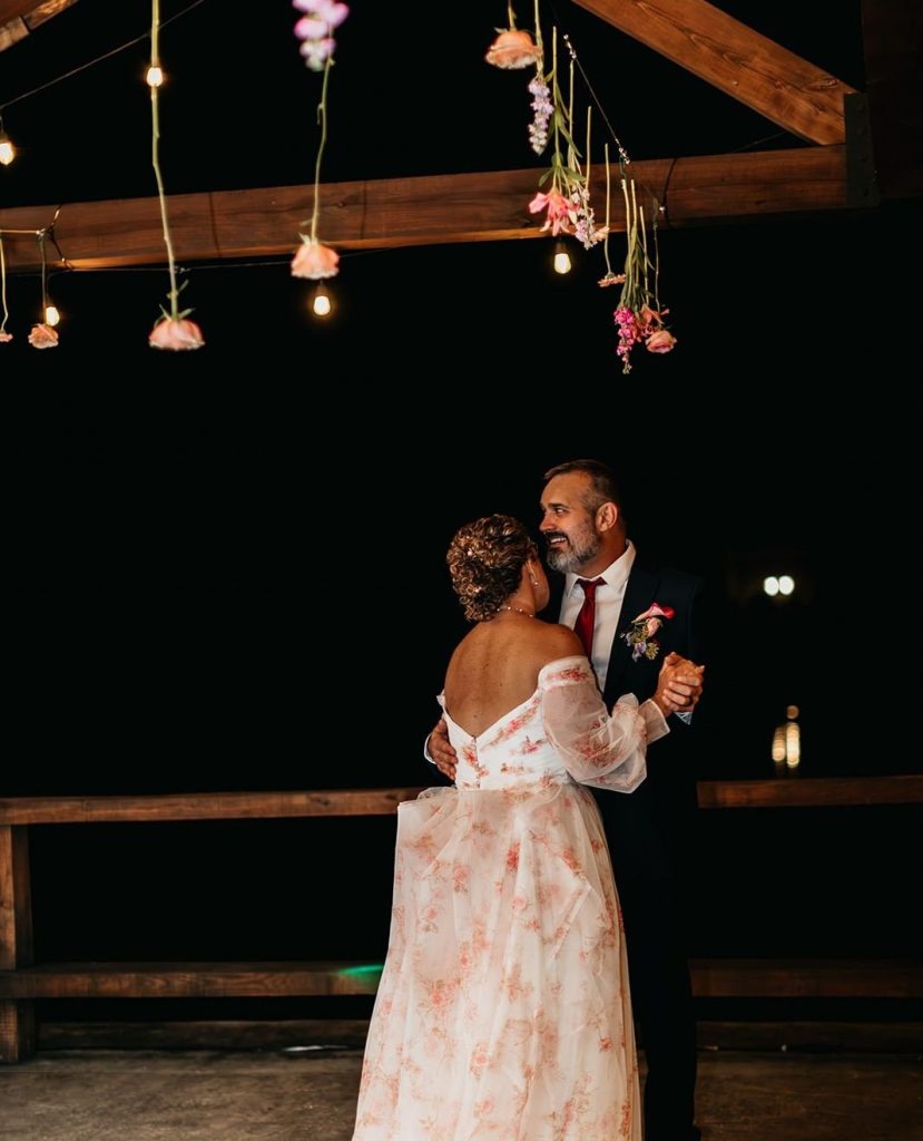 Isabel and Henry dancing on outdoor deck at sunset