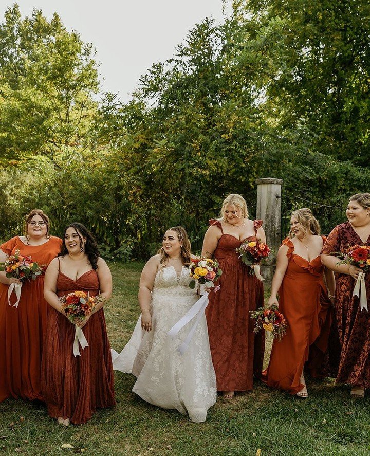 The bridesmaid dresses were autumn perfection. A palette of burnt orange, rust, and warm terracotta tones created the dreamiest seasonal lineup: rich, cozy, and effortlessly chic. They popped beautifully against the changing leaves and added so much warmth to the day’s overall aesthetic.