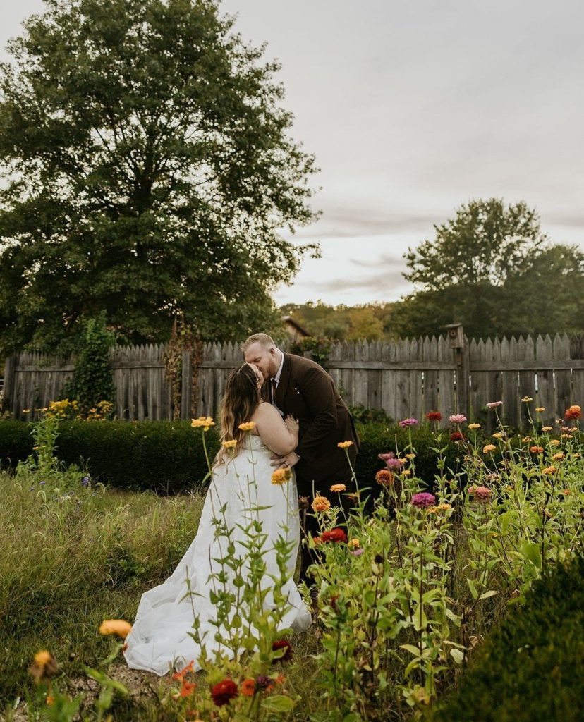 Natalie was stunning in her lace strapless gown, it was elegant with just the right touch of drama. The lace detailing felt classic, while the silhouette gave her that effortless bridal glow. She truly embodied that moody-meets-ethereal fall bride energy. The florals echoed the season in the best way: layered textures in deep burgundy and golden mustard. Natalie & Sam even had portraits in the zinnia garden. Pure magic. The blooms added a playful burst of color that complemented the deeper autumn hues so beautifully.