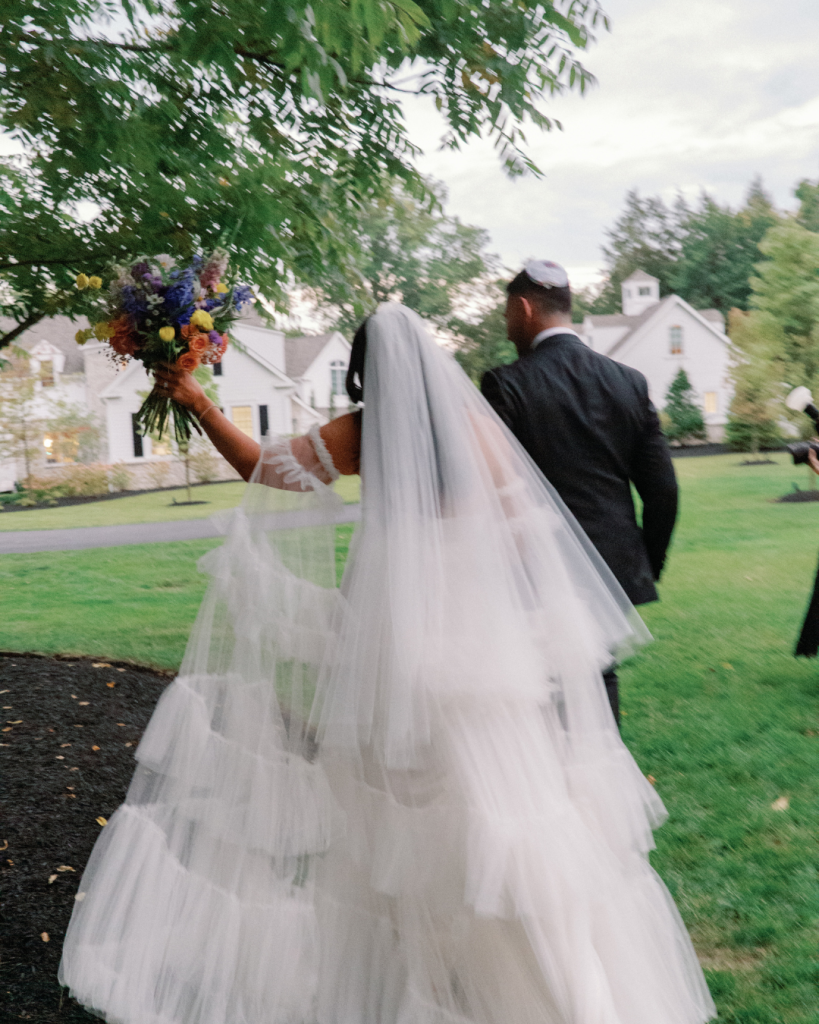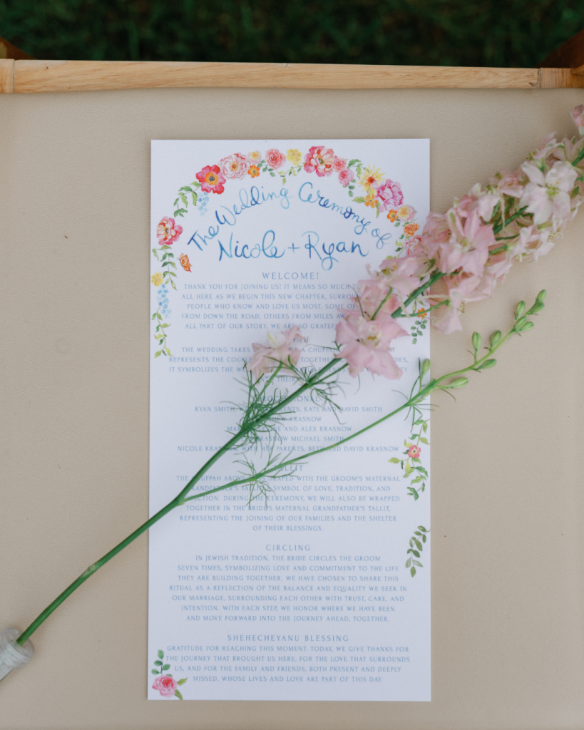 Nicole and Ryan are both Jewish, and their ceremony was filled with meaningful traditions. Nicole shared some special moments that tied their heritage and family together in their ceremony, “We are both Jewish, so had a traditional Jewish ceremony. It was really special to stand under our gorgeous chuppah, with tallit belonging to both of our grandfathers. We drank wine from the same cup my parents drank out of, and all of the kippahs at the ceremony were handmade by my mother-in-law. These special touches, highlighting our Judaism, and how important family is to us, really made the ceremony feel even more special.”