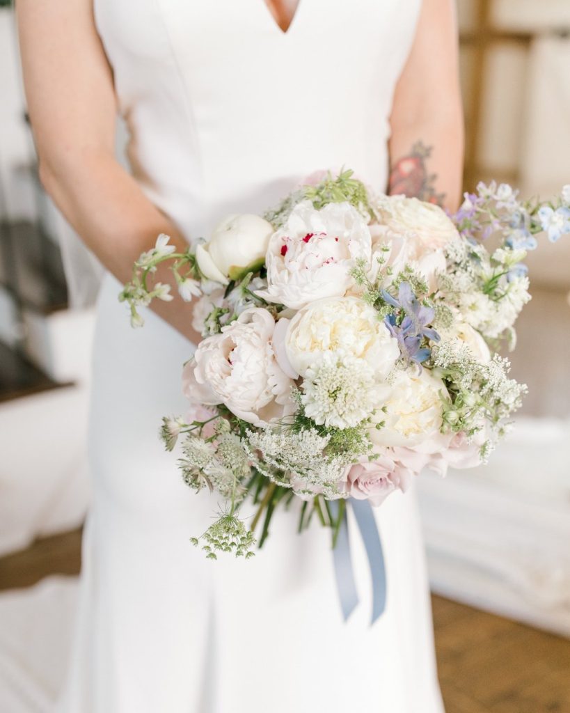 The bridal bouquet was gorgeous with peonies, lilac tones, and fresh summer blooms—it felt as though it had been picked from a storybook garden. Even the cake carried a hint of magic, adorned with delicate light-blue detailing that tied the entire palette together.