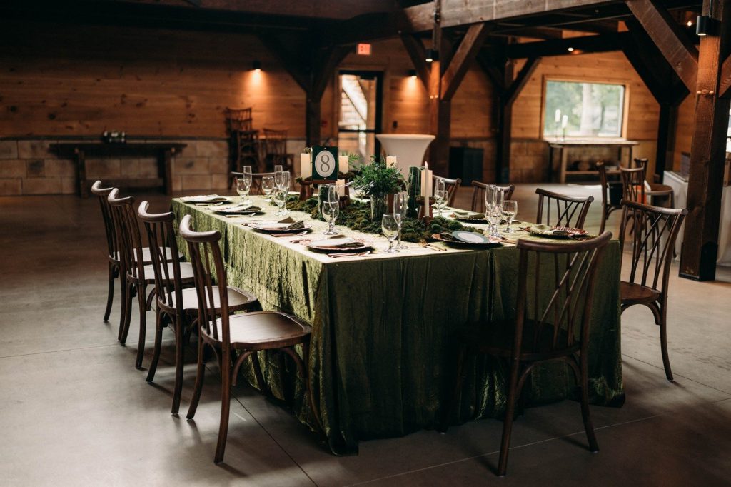 The long wooden table became the heart of the design. Deep evergreen tones paired beautifully with soft, lighter greens, echoing the winter landscape just beyond the lodge windows. The color palette was both refreshing and calming—nature-inspired yet elevated enough for a refined winter celebration. The textures of the wood, greenery, and curated details felt like winter’s embrace brought indoors.