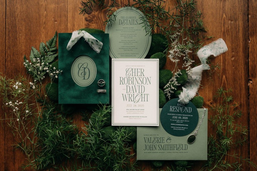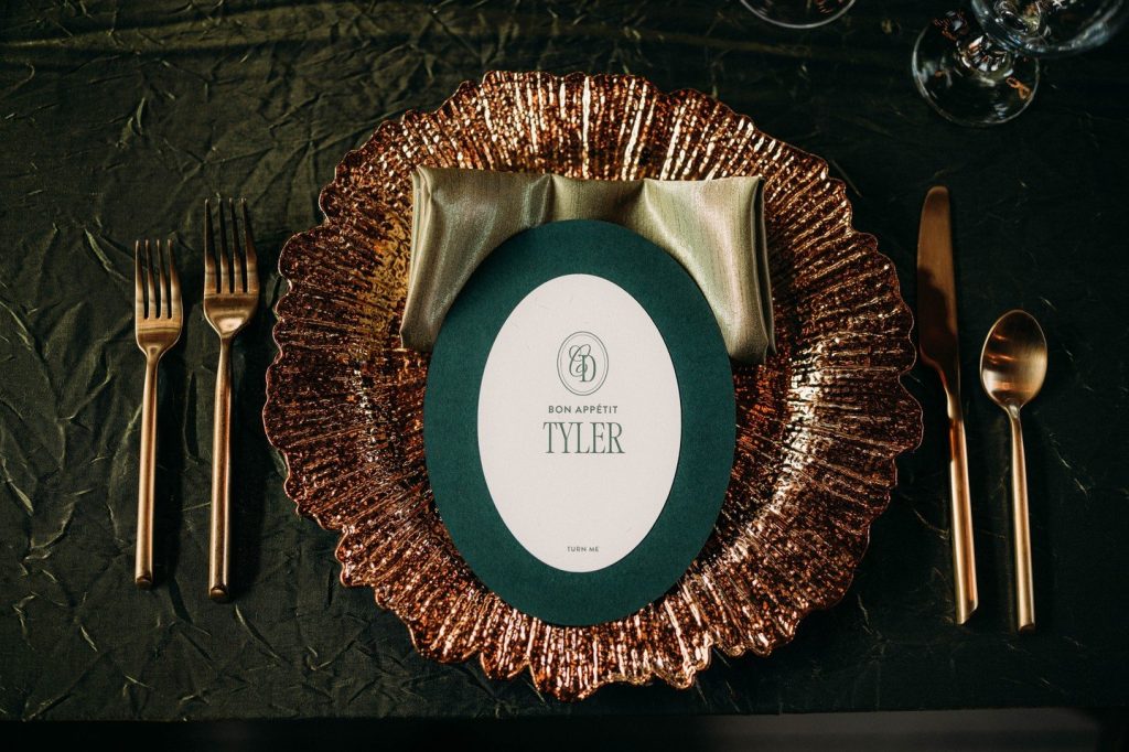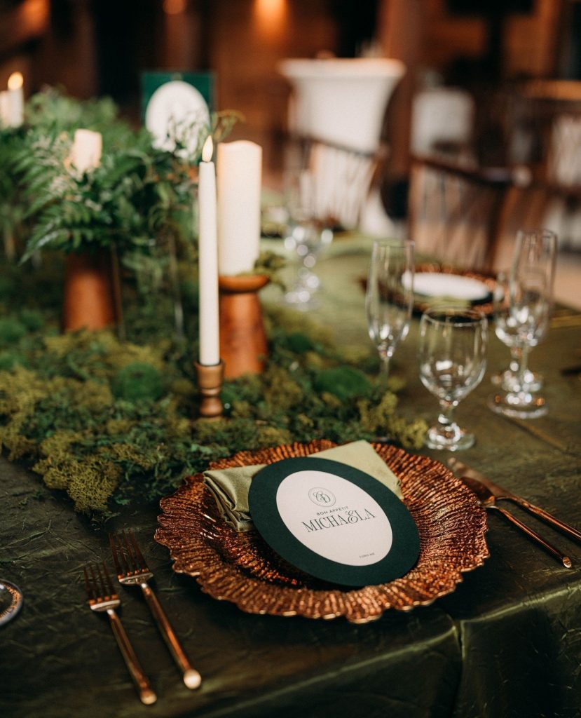 Nico Creative crafted an exquisite invitation suite that set the tone for the shoot. Filled with evergreen hues and organic textures, the stationery was a seamless extension of the natural beauty surrounding the lodge. Their artistry carried through to the table numbers and place settings, where each guest’s name was elegantly displayed on their plate. These thoughtful details added a personal, intentional touch that made the tablescape feel intimate and complete.