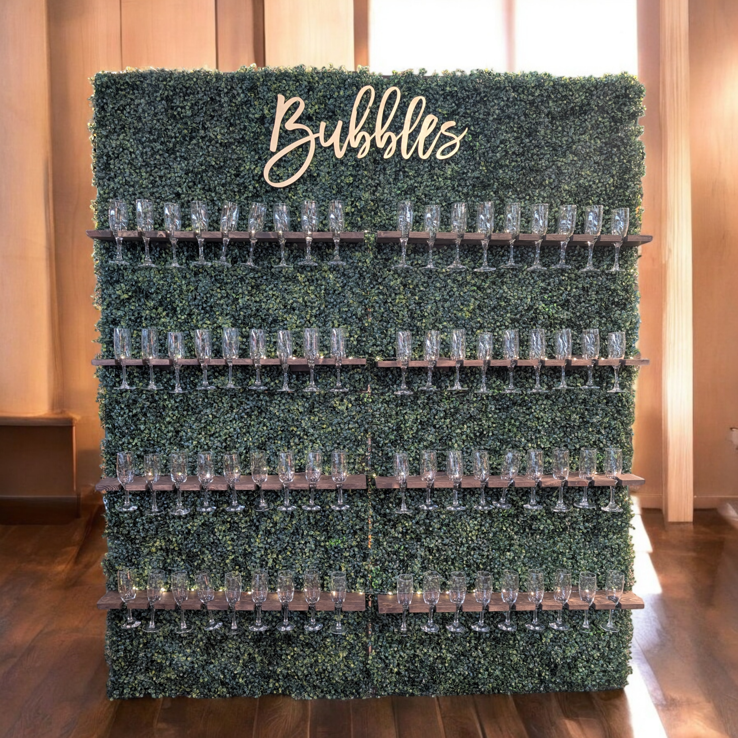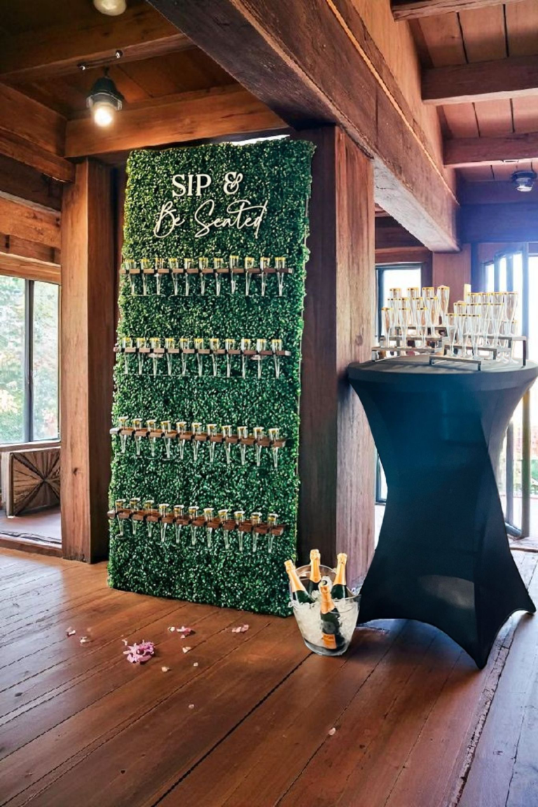 At CLE Champagne Wall, we specialize in a variety of stunning champagne and celebration walls with versatile designs. Each wall can serve multiple purposes—beyond just champagne —ensuring you have something truly special to elevate your event. While our walls are perfect for champagne, they are also perfect for wine, beer, cocktails, mimosas and mocktails with our various shelving options. You may even consider charcuterie or a dessert wall! We love that our wall options are truly unlimited from our mini personalized walls to our stunning statement piece black wall and most popular lush greenery wall; both standing 7' tall. Whichever wall you choose, it will be ready for your special night! Be it a champagne welcome drink, wedding toast or a dual purpose wall posing as a Champagne Wall Seating Chart Wall, a Flower Bud Vase Wedding Favor Wall or any special wedding favor for your guests. Whatever you choose, it will be sure to impress! Need ideas? We are here to help!