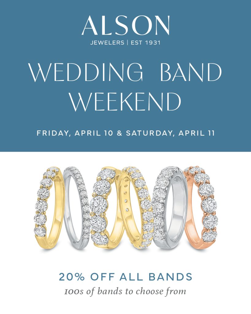 Join Alson Jewelers for the spring edition of Wedding Band Weekend. Make a date of it! Browse our extensive collection of men's and women's wedding bands in white, yellow and rose gold, or platinum and enjoy cocktails while you look!...